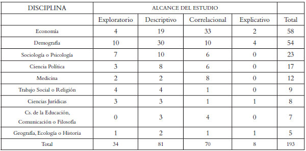 Como se observa aquí, la economía y demografía son las ciencias o disciplinas quemás contribuyen a la producción total en el tema, y el nivel de sus estudios – al considerarel criterio alcance – corresponde también a los de tipo correlacional en mayor proporciónque las demás ciencias o disciplinas, cuyas modas corresponden a los exploratorios.