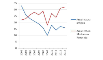 Así, y a pesar de que las bases del concurso mantienen de forma invariable el área donde deben estar ubicados los patios para participar en el CPP, el número de patios de “arquitectura antigua” han ido decreciendo paulatinamente y aumentando los de arquitectura moderna o renovada2. Dentro de esta tendencia se encuentra igualmente el detrimento de patios de casas multifamiliares, donde tienen lugar la mayor parte de las actividades sociales que reconoce y premia el concurso: solidaridad, vida en común, participación colectiva en el cuidado y arreglo del patio, así como integración del patio en la vida cotidiana3. En el año 2004 se confirma la inversión en el tipo de patios que solicitan su inscripción en el CPP (Fig. 2) y es cuando el ayuntamiento decide por primera vez la realización de un expediente que permita a los patios de Córdoba optar a su reconocimiento como Patrimonio Inmaterial de la UNESCO como medida urgente de salvaguardia.