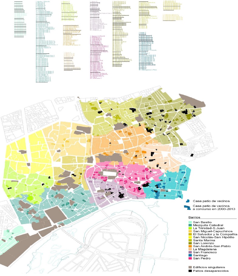 Como han mostrado Murillo et al. (1999) la Qurtuba andalusí (711-1236), se articula de extremo a extremo gracias a las calles principales que parten de las siete puertas de la ciudad, atendiendo en buena parte al viejo cardo máximo de la Colonia Patricia. Del mismo modo, el espacio doméstico musulmán sigue un proceso de continuidad a partir del caserío romano, en el que el patio, como lo fue el peristilo, constituye el elemento articulador principal de la vivienda andalusí, al menos en la Madina. Se señalan sin embargo dos diferencias notables: en primer lugar, la casa islámica tiene un carácter introvertido: es diseñada desde adentro hacia afuera y emplea, además, una arquitectura más flexible, cuyas modificaciones serán siempre absorbidas a través del espacio libre interior. La casa andalusí cuenta con una sola puerta, a la que da servidumbre un adarve, callejón sin salida que penetra en el corazón de las manzanas edificadas, más que una calle, lo que refuerza este carácter. Hacia adentro, la puerta conduce a un zaguán, y éste directamente al patio, el corazón de la casa, al que se abren todas las habitaciones (Murillo et al., 1999: 131-150). Hernández (1999) ha demostrado que a fines de la Edad Media las “casas de vecinos” constituyen una tipología de vivienda muy extendida en Córdoba. Las también denominadas “casas de vecindad”,“casas de partido” o “patios de vecindad”, son resultado del aprovechamiento de otras edificaciones –en especial conventos y casas señoriales– que, al compartimentarse, pudieron albergar a distintas familias en alojamientos y viviendas reducidas (Hernández, 1999: 271). Este carácter de “viviendas de uso compartido” se encuentra también en los “corrales” o “casas corrales”, una estructura típica del siglo XVI que responde sin embargo a un programa arquitectónico concebido como tal. Se trata de una crujía perimetral en galerías de dos o más plantas de altura, que vuelca hacia un espacio interior o patio (Morales, 1981: 14). Ambas formas constituyen una unidad urbanística que se caracteriza por la yuxtaposición de espacios de uso privado y común, siendo los servicios comunes más habituales la cocina, la pila, el pozo, la casa-puerta, el corral y el patín o patio (Hernández, 1999: 274). Las conclusiones que interesan a nuestra investigación son dos: en primer lugar que las viviendas en las que los elementos y servicios comunes superan a los espacios privados son las más numerosas, representando un 58,2% del total (Hernández, 1999: 280); además, que la mayor parte de estas casas se ubicaban en los barrios más populosos de la ciudad en los siglos bajomedievales: San Pedro, San Andrés, Santa Marina y Santa María (Escobar, 1989: 186). Es en estos barrios, que conforman la zona conocida como Axerquía, dónde han pervivido las casas de vecinos, muchas de ellas aún en uso y habituales en el CPP. (Fig. 3)