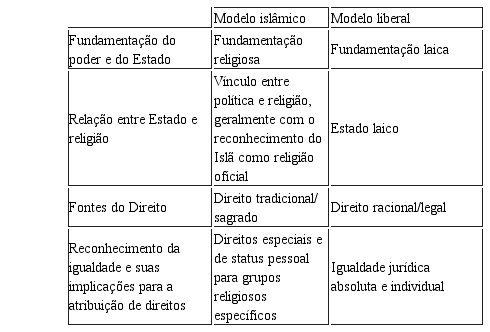 Após essa breve apresentação das principais características da tradição islâmica e do modelo liberal, elas podem ser sintetizadas de forma comparada da seguinte maneira: