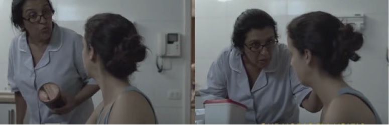 Ao longo do filme, são frequentes cenas em que Val tenta falar e não é ouvida e, sobretudo, cenas que exibem a dependência dos patrões em relação a ela para atender demandas triviais, como buscar um copo d’água ou acender uma luz. Os vínculos que se estabelecem entre patrões e doméstica revelam uma relação de dominação, que parece natural a todos, recebendo, inclusive, o apoio da própriaVal, que cumpre, com satisfação,“as tarefas subordinadas ou subalternas que lhe são atribuídas por suas virtudes de submissão, de gentileza, de docilidade, de devotamento e de abnegação” (Bourdieu, 2002, p. 36). Todas estas são características culturalmente atribuídas à figura da mulher, historicamente responsável pelo trabalho doméstico.