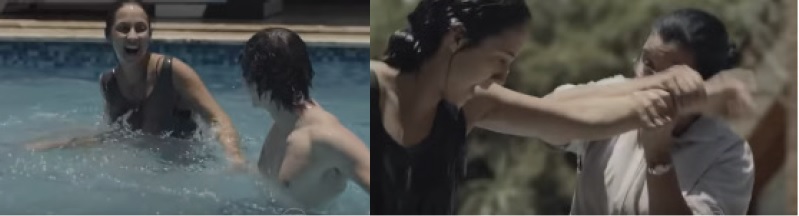 Em seguida, entretanto, Val se ausenta e Fabinho chega acompanhado de um colega para se divertirem na piscina. Quando convidam Jéssica para entrar, ela, embora visivelmente contrariada, atende à recomendação da mãe. Eles, todavia, acabam por jogá- la dentro d’água com a roupa mesmo, e os três passam a se divertir juntos. O barulho chama a atenção de Bárbara que, a essas alturas, já sente a ameaça crescente à estrutura do campo e explicita as regras de forma contundente: “Brincadeira idiota Fabinho, tira ela daí” – e se dirigindo a Jéssica:“Dá pra você obedecer sua mãe que ela tá falando com você? ”