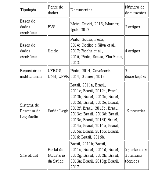 Os dados foram produzidos com base na revisão da literatura normativa, técnica e científica, que permitiu identificar o conteúdo do programa em portarias reguladoras, manuais instrutivos, artigos científicos e dissertações.