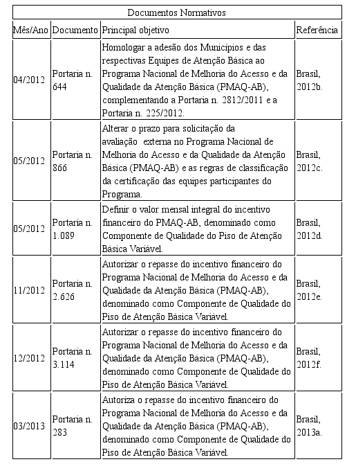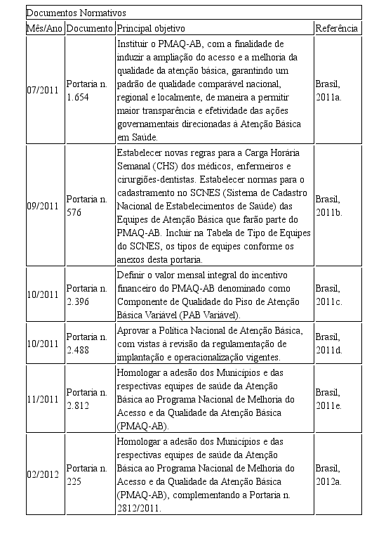 BRASIL. Ministério da Saúde. Portaria n. 535, de 3 de abril de 2013.Altera a Portaria n. 1.654/GM/MS, de 19 de julho de 2011, que institui, no âmbito do Sistema Único de Saúde, o Programa Nacional de Melhoria do Acesso e da Qualidade da Atenção Básica (PMAQ-AB), e a Portaria n. 866/GM/MS, de 3 de maio de 2012, que altera o prazo para solicitação da avaliação externa no Programa Nacional de Melhoria do Acesso e da Qualidade da Atenção Básica (PMAQ-AB). Diário Oficial da União, Brasília, DF, 4 abr. 2013b. Seção 1, p. 35.