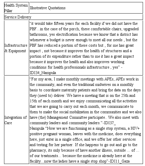 The results from the study show that health workers reported PBF as having had good, bad and disruptive perceived effects on all pillars at variable magnitudes. Overall, the PBF scheme was perceived to have had the greatest effect in the areas of service delivery, health workforce, and information systems. It had more modest effects on health financing and governance, and no effect on the supply of pharmaceutical commodities (by design).