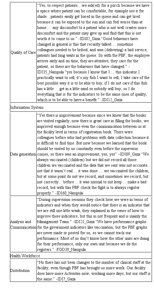 While the body of research on PBF has grown significantly in the past few years, recent reviews of the literature have found that, firstly, the evidence about the impact of PBF programs on health system outputs and health outcomes is mixed and, secondly, a lot remains unknown about how PBF acts on the health system (Witter et al., 2012; Renmans et al., 2016a; Paul; Renmans, 2017). This study speaks to the second observation, using a PBF program in Mozambique to understand how PBF influences actors, institutions, and processes that comprise the health system. The approach we adopted of interviewing health workers to capture their perceptions is similar to what others have used to explore key aspects of PBF programs, such as the implementation process and the effect of PBF on staff motivation (Bhatnagar; George, 2016; Kalk; Paul; Grabosch, 2010). Our application of evaluating PBF across the entire health systems pillars, as defined by Witter et al. (2013), about the changes attributed to the PBF program is novel. While other articles have documented the perceived effects of PBF interventions on individual building blocks like service delivery, (Bonfrer; Van de Poel; Van Doorslaer, 2014; Chimhutu et al., 2015; Skiles et al., 2015; Flink et al., 2016; Kalk; Paul; Grabosch, 2010; Paul, 2009; Bhatnagar; George, 2016) human resources for health,(Matsuoka et al., 2014; Engineer et al., 2016; Lohmann et al., 2017a; Lohmann et al., 2018) and health information system, (Rusa et al., 2009; Kalk; Paul; Grabosch, 2010) no study to date has used a comprehensive health systems lens to systematically explore the perceived effects of PBF on all pillars.