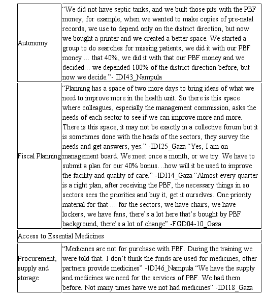 Financial autonomy was perceived as a key change and driver of program impact. Facility administrators and managers (typically chief nurses and senior medical technicians) had a positive disposition toward having the autonomy to manage their own ‘pot’ of money based on a process of strategic planning and coordination with the provincial health office and implementer. Conversely, staff at non-autonomous facilities, where district health offices receive the facility’s funds and then distribute the staff incentives and facility investments, felt that the districts often delayed their incentives and that they did not receive the full amount earned.