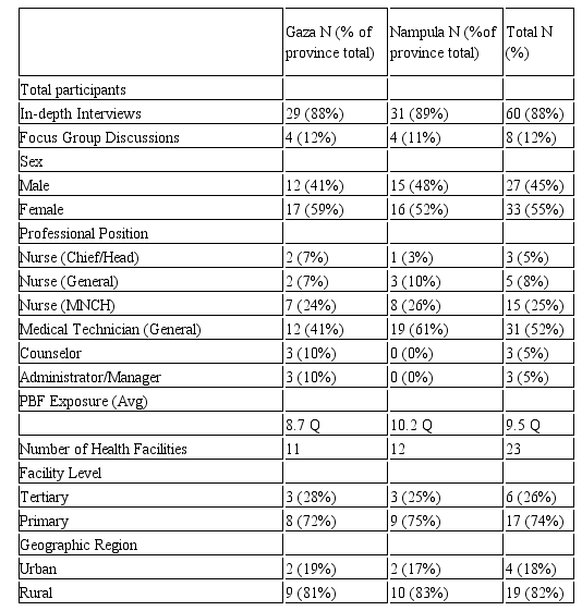 In each facility, health workers (nurses, medical technicians, and physicians), community health workers and facility administrators were sampled based on their exposure to PBF (minimum of nine months) and availability given we collected data through unannounced facility visits during normal clinic hours. Sixty health workers and facility managers were interviewed individually and a total of 30 health workers participated in focus group discussions (Table 1). Health workers typically participated in the PBF program for an average of 9.5 quarters (2.4 years). Semi-structured interview and group discussion guides were used during the interviews, allowing for open dialogue and discussion about the effects of PBF on health system components including service delivery, financing, governance, human resources, access to medicines, and information systems. Data was collected by two Mozambican researchers between November-December 2015.