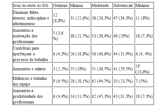 Na Tabela 1, a respeito dos efeitos produzidos pelo IDQ, a maioria identificou que houve diminuição de faltas, atrasos, indisciplina e afastamento. Afirmaram também que houve aumento na motivação e produtividade dos profissionais. Quanto ao impacto sobre os salários, a maioria classificou o aumento como moderado ou substancial. Além disso, identificou-se que houve melhora do trabalho em equipe e aumento da produtividade dos profissionais (Tabela 1).