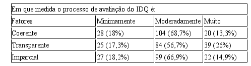 Sobre o processo avaliativo do IDQ realizado aos servidores (Tabela 2), os profissionais afirmaram que a avaliação individual às vezes levava a uma melhoria de desempenho e que era moderadamente coerente, transparente e imparcial.