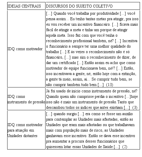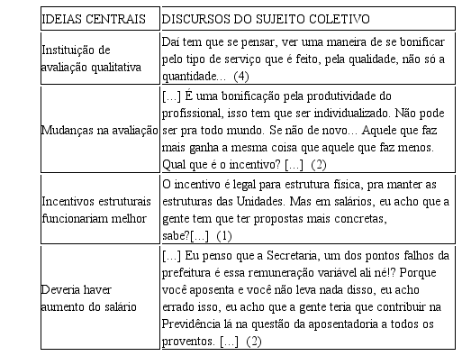 Emergiu ainda nos discursos, as diferenças entre incentivos estruturais e individuais. Os primeiros referem-se à concessão de recursos para a Unidade de Saúde realizar melhorias nas condições de trabalho das equipes; ao passo que os segundos relacionam-se ao pagamento dos profissionais composto por uma parte fixa e outra variável (Costa e Silva; Escoval; Hortale, 2014). Segundo o entendimento expresso no discurso, os incentivos estruturais seriam melhores, uma vez que propiciam melhorias no ambiente de trabalho; já os individuais são arriscados, pois estes valores não são incorporados ao salário.