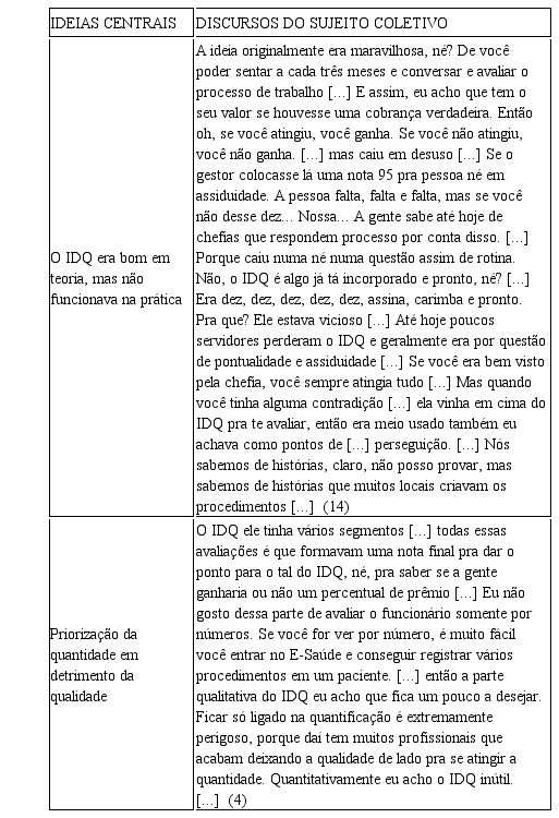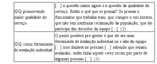 Identificou-se ainda que o IDQ foi considerado um instrumento de pressão, de modo que a possibilidade de perda do incentivo seria uma punição para aqueles servidores que não atingissem as metas estipuladas, sendo algo positivo para estimular os profissionais a realizarem suas funções. Porém, ressalta-se que não deve ser apenas um instrumento de punição, mas de diálogo e incentivo.