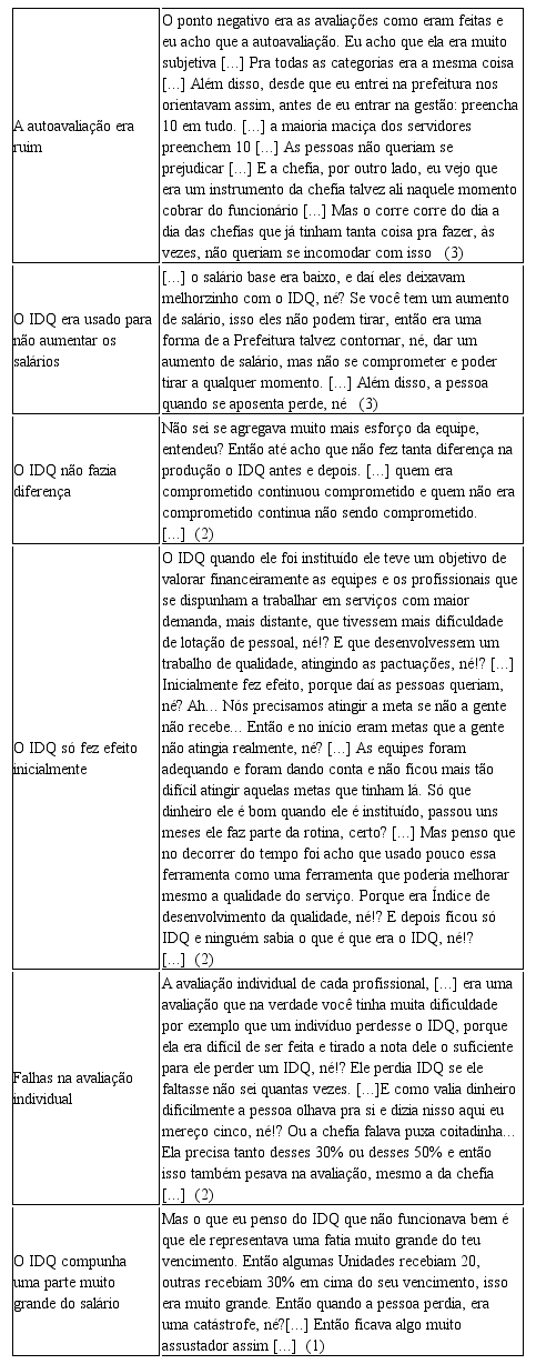 Entretanto, com o tempo a avaliação se tornou apenas mais uma rotina, não sendo realizada da forma como se preconizava em teoria. Os problemas foram relacionados principalmente à avaliação individual e à autoavaliação. Nesta, dificilmente os profissionais atribuíam a si mesmos uma nota inferior a dez, enquanto na individual, por vezes, não havia impessoalidade e transparência. Raramente os profissionais perdiam a bonificação do IDQ, de forma que todos a recebiam independente da qualidade de seus serviços. Outras dificuldades constatadas referem-se à priorização da quantidade na avaliação da Unidade, à fraude de informações para atingir as metas, e ao fato de os incentivos serem empregados como manobra para não aumentar os salários dos servidores, sendo apenas uma bonificação temporária, que não era agregada ao salário nem às futuras aposentadorias.
