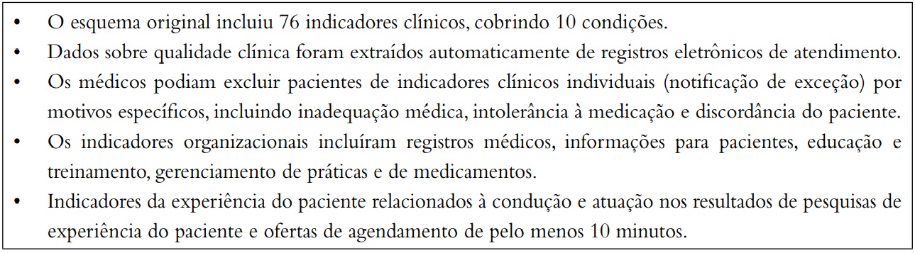 organizacionais da atenção e na experiência do paciente (vide Quadro 1). Os indicadores clínicos desenvolveram-se e ampliaram-se para incluir mais condições ao longo dos anos, entretanto,os indicadores organizacionais foram eliminados em 2012 quando praticamente todos os aspectos atingiram os 100%. Por sua vez, os indicadores relativos à experiência do paciente sofreram diversas alterações, mas nunca foram implementados com sucesso (veja exemplos no Quadro 2).