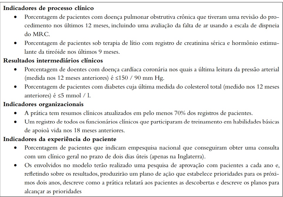 Os clínicos cujo desempenho são avaliados deveriam estar envolvidos na seleção de indicadores, no uso de avaliação sistemática de evidências e no trabalho com especialistas para a construção técnica de indicadores válidos e confiáveis. Os indicadores, por si só, devem ter uma forte validade aparente, seja por meio de uma base de evidências ou de um amplo consenso profissional. O QOF do Reino Unido passou por problemas no final dos anos 2000, em parte como resultado da introdução de indicadores que tinham pouco consenso profissional (por exemplo, a realização de um mapeamento de sintomas para pacientes com depressão), pareciam ter uma agenda muito mais gerencial do que clínica (por exemplo, incentivos desenhados para reduzir internações de emergência), ou tinham fórmulas mal construídas, ligando o desempenho ao pagamento (por exemplo, dados de pesquisas com pacientes). O resultado obtido foi que os clínicos gerais perderam a confiança no esquema.