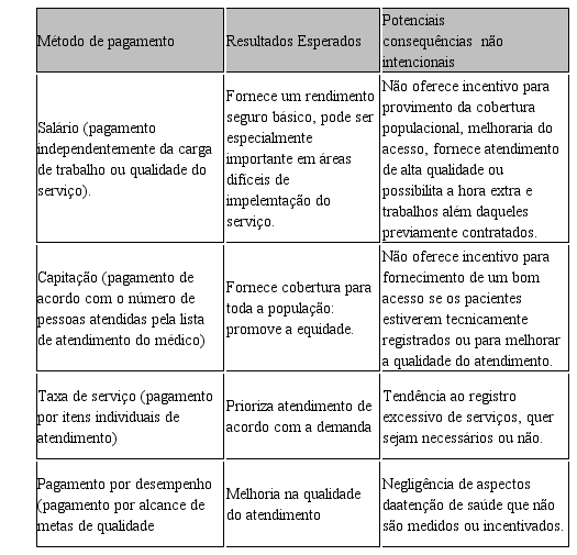 A experiência observada dos esquemas de pagamento por desempenho em todo o mundo é que eles têm menos efeito do que os financiadores esperam, e esses arranjos devem, portanto, ser vistos como parte de uma estratégia de melhoria de qualidade mais ampla (Roland; Dudley, 2015). No entanto, nenhum sistema de pagamento é perfeito e todos têm vantagens e desvantagens potenciais (vide Tabela 1). Este fato está por trás das tentativas de desenvolver sistemas de pagamento “combinados”, desenhados para fornecer cobertura populacional e bom acesso, sem comprometer a qualidade do atendimento.