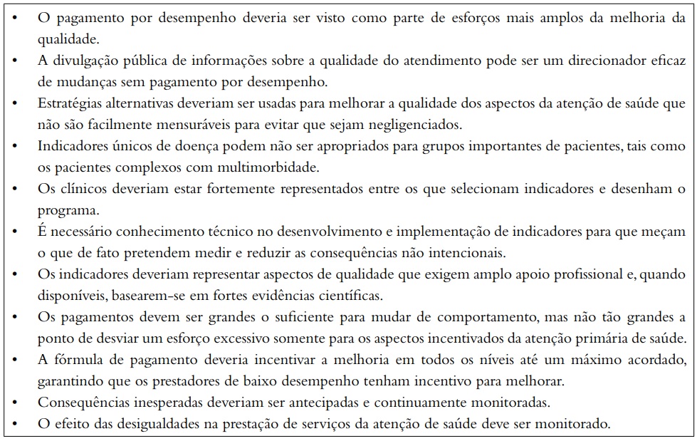Não existe um sistema perfeito de pagamento da atenção médica, nem um isento de potenciais consequências não intencionais. E há um argumento para incluir os elementos do pagamento por desempenho na assistência médica. No entanto, os riscos e consequências não intencionais sempre precisam ser levados em conta, assim como o contexto organizacional no qual os incentivos são introduzidos – por exemplo, se a recompensa é direcionada para o indivíduo, a equipe, a clínica ou grupos de clínicos gerais; como isso pode afetar o comportamento de clínicos individuais; e como isso levará a uma melhor atenção de saúde. É necessária uma pesquisa sobre formas mais sofisticadas de uso de indicadores para melhorar a qualidade do atendimento e para avaliar a introdução do pagamento por desempenho em diferentes configurações (Kristensen et al., 2014).