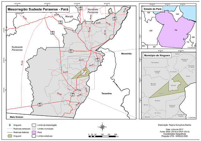 A cidade de Xinguara localiza-se na Mesorregião Sudeste Paraense, delimitação geográfica formalizada pelo IBGE que reúne 39 municípios, conforme pode-se ver no mapa abaixo. Entretanto, usaremos a designação corriqueira de sul do Pará como referência à sua localização no estado. O município foi criado em 13 de maio de 1982, a partir do desmembramento do município de Conceição do Araguaia. Em 2010, contava com uma população de 40.573 habitantes.