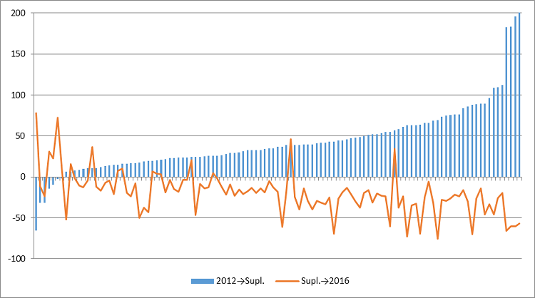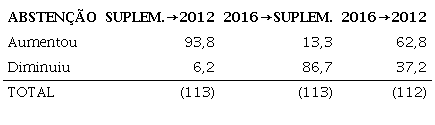 O Gráfico 1 apresenta as informações calculadas pela taxa de variação no índice de abstenção registrada na passagem da eleição de 2012 para a suplementar e desta para a de 2016. O contraste é nítido e aponta a tendência de alta na 1ª medição e de queda na 2ª.