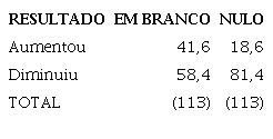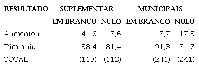 Porém, o comportamento do eleitorado foi distinto: a abstenção aumentou em 93,8% dos casos e a invalidação diminuiu em 72,6%. Assim, os elementos que podem explicar um não são os mesmos que cabem ao outro, o que consagra a interpretação de Lima Júnior (1993, p. 101) de que “o que leva o eleitor a abster-se não é exatamente o que leva o eleitor a votar em branco ou a anular o voto” e desmente a de Lavareda (1991, p. 40), segundo a qual eles seriam os equivalentes funcionais da abstenção em países de voto obrigatório.