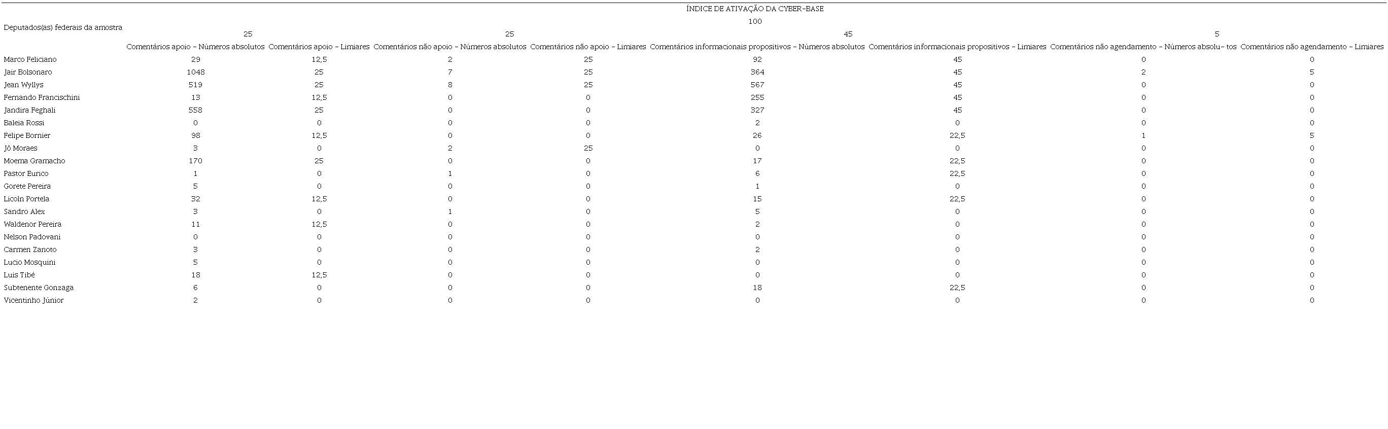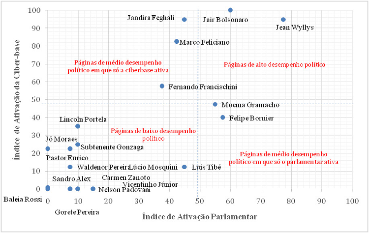 Deve-se ressaltar um caso peculiar nesse estudo: o caso de Jair Bolsonaro. Esse parlamentar é o único que atingiu pontuação máxima no índice de ativação da ciber-base, o que quer dizer que os cidadãos que o seguem ativam muito a sua página no Facebook. Isso reforça o que foi dito anteriormente, de que o deputado tem uma grande militância online. Todavia, se considerarmos proporcionalmente o número de comentários feitos por ele, o deputado e a sua equipe respondem relativamente pouco. Portanto, a sua apropriação no Facebook depende mais da sua ciber-base para impulsionar e fomentar a sua página.