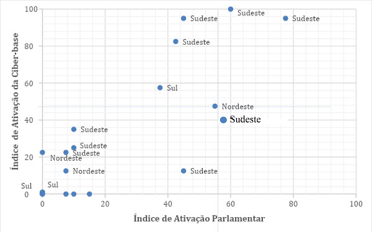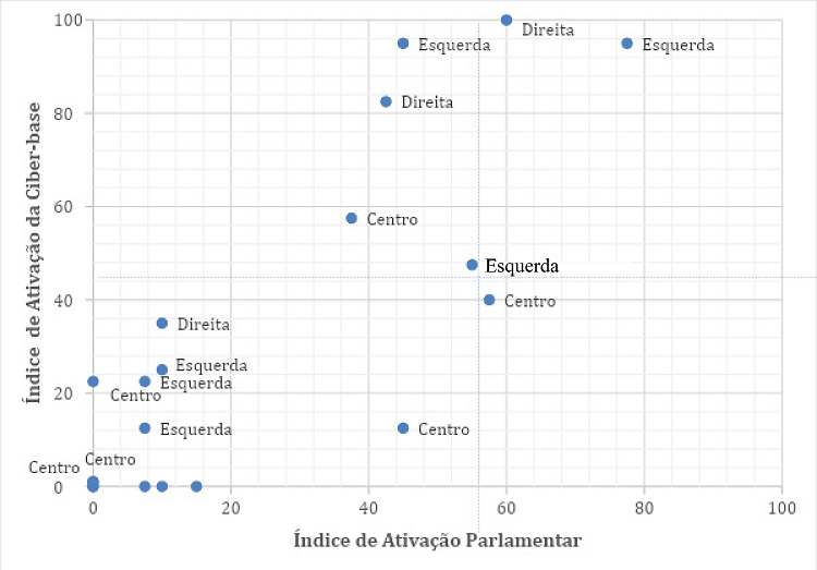 A partir da construção dos índices e análise dos resultados que eles apresentam, colocamos esses índices para interagir em um plano cartesiano X e Y: “Índice de Ativação da Ciber-base” e “Índice de Ativação parlamentar”, respectivamente. O gráfico de dispersão a seguir (Gráfico 1) mostra a interação entre os dois índices criados e os posicionamentos dos perfis analisados nos quadrantes. A partir dos posicionamentos nos quadrantes, identificamos quatro tipos de páginas de parlamentares no Facebook. São elas: