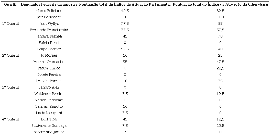 Ao analisar a escala de pontuação final do “Índice de Ativação Parlamentar”, que vai de 0 a 100, algumas observações importantes podem ser feitas a partir da amostra analisada. O deputado federal que obteve a maior pontuação no “Índice de Ativação Parlamentar” foi Jean Wyllys (77,5). Em segundo lugar esteve Jair Bolsonaro (60). Em terceiro, está Felipe Bornier (57,5) e em quarto lugar Moema Gramacho (55). Chama atenção que o 3º e 4º lugares no “Índice de Ativação Parlamentar” são parlamentares que se localizam no segundo quartil de seguidores, conseguindo ultrapassar a performance de deputados que, supostamente, deveriam estar mais preocupados em manter suas páginas mais ativas, já que têm mais público (Tabela 10). No entanto, como ficará mais visível na análise do “Índice de Ativação da Ciber-base”, parece que os deputados do 1º quartil contam com uma ciber-base extremamente ativa e por isso podem “se dar ao luxo” de delegar à sua ciber-base o protagonismo e a manutenção do debate.