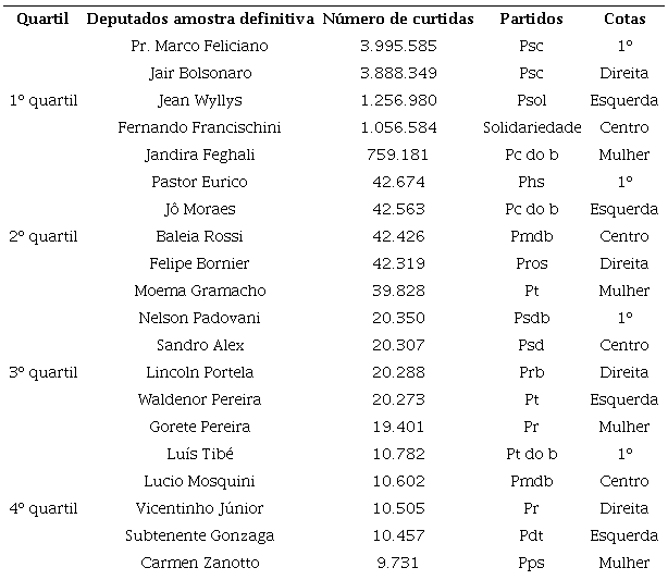 Os dados utilizados para medir a tipologia de atuação de parlamentares no Facebook fazem parte do banco de dados construído por Almeida (2017), que utilizou como unidade de análise os deputados federais da Câmara dos Deputados brasileira, durante 55ª Legislatura da Câmara dos Deputados (2015 - 2019). A partir desse banco de dados, formatou-se uma amostra de 20 deputados federais, usando os seguintes critérios com um objetivo de promover uma heterogeneidade da análise: 1) os deputados escolhidos foram retirados por quartil de seguidores: 5 de cada quartil; 2) os deputados escolhidos foram retirados de acordo com sua posição em relação ao número de curtidas e de acordo com as seguintes cotas: a) o 1º deles sempre é o deputado com mais curtidas do quartil; b) o 2º, o 3º e o 4º foram escolhidos por sua ideologia partidária3. Necessariamente deveria haver, entre as 3 (três) posições: 1 deputado de esquerda, 1 deputado de centro e 1 deputado de direita; c) a 5ª deputada foi escolhida por seu sexo e deve ser mulher, não importando que nas outras cotas já tenha aparecido uma mulher (Tabela 1).