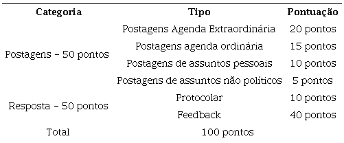 1) agenda extraordinária (20 pontos): são postagens em que o conteúdo esteve relacionado a questões políticas “emergenciais” ou que não dizem respeito propriamente às atividades diárias do parlamentar. O conteúdo de agenda extraordinária foi considerado com alto nível de importância para a nossa análise, pois diz respeito a questões políticas de uma forma geral, que vão além das tarefas do parlamentar, que em certos casos mobiliza a opinião pública e a agenda política nacional.