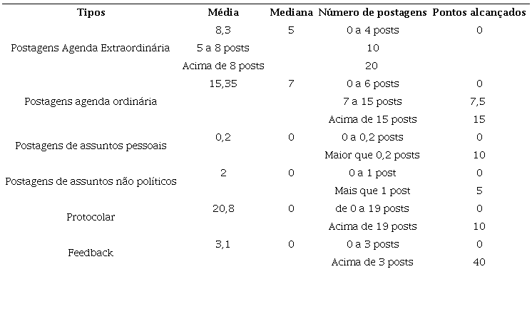 Após estabelecer esses critérios, iniciamos a pontuação das páginas dos deputados analisados. A partir do somatório de cada tipo de postagem e cada tipo de resposta das páginas definidas anteriormente, calculamos a média e a mediana desses valores e estabelecemos os limiares de pontuação (Tabela 3).