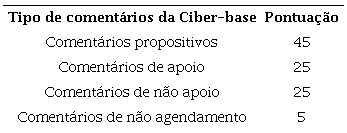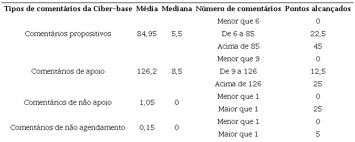 Para isso, foi construído o índice 2, “Índice de Ativação da Ciber-base” (Tabela 4), localizado no eixo x, que foi feito de forma análoga ao índice 1. A composição do índice se deu pelo somatório de tipos de comentários (100 pontos), também categorizados pela análise de conteúdo. A distribuição de pontos foi feita também pelos autores de acordo com a ordem de importância, a saber: