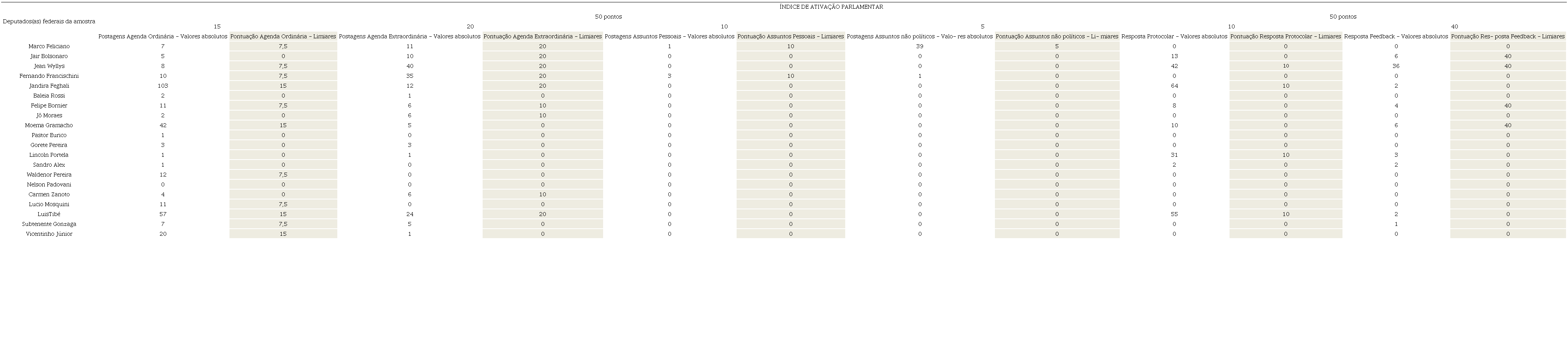 Em continuidade, vemos que no 5º lugar no “Índice de Ativação Parlamentar” estão empatados Jandira Feghali e um deputado proveniente do último quartil de curtidas: Luis Tibé, com 45 pontos. Em 6º lugar está Marco Feliciano (42,5 pontos), em 7º lugar Fernando Francischini (37,5 pontos).