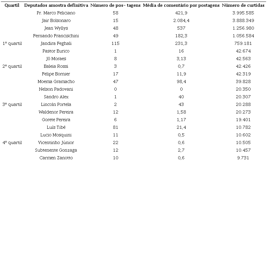 Chama-se atenção que a listagem de deputados a seguir está ordenada pelos “quartis de curtidas”, ou seja, os 5 (cinco) primeiros deputados da lista foram os que tiveram os maiores números de curtidas em suas respectivas páginas. Por isso chama atenção que Jair Bolsonaro, o segundo em número de curtidas, tenha postado tão pouco - apenas 15 vezes - ao passo que os demais que compõem esse quartil postaram entre 48 e 115 vezes. É ainda importante observar que há deputados que estão atrás no que diz respeito ao número de seguidores de suas páginas, mas que, ainda assim, empenham esforços para ter uma página ativada por eles mesmos, como se pode observar nos casos de Luis Tibé (localizado no último quartil de curtidas) e de Moema Gramacho (que está presente no segundo quartil de curtidas).