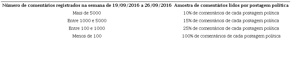 A partir da amostra de deputados, foi determinado o recorte temporal de uma semana completa para a análise dos dados, de 19/09/2016 a 26/09/20164. No total, foram lidas todas as 518 postagens e 11488 comentários feitos nas páginas de deputados federais na semana de atividades selecionada.