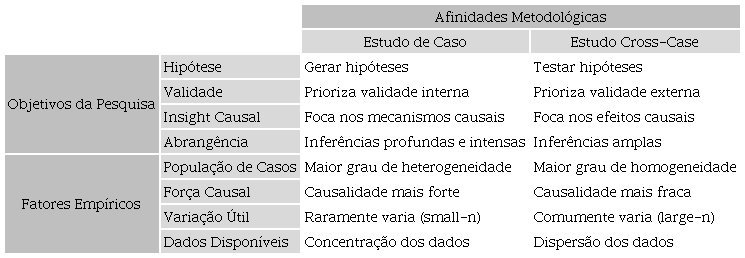 Aqui, reafirmamos nossa postura que diferencia cross-case de estudo de caso de algum fenômeno ou evento que engloba vários casos. Isso não nos isenta da importância de mostrar o quanto é relevante analisar as afinidades entre os dois métodos, inclusive para diferenciá-los. É ilustrativo o exercício feito por Gerring (2007) sobre isso. Com base em sua definição, o autor elenca oito possíveis afinidades metodológicas dos estudos de caso e dos estudos cross-case, sob as dimensões dos objetivos da pesquisa e formato do universo empírico, como presentes no quadro 1. Essas afinidades são entendidas como atributos do estudo de caso que, frequentemente, mas não sempre, são associados com os estudos de caso, mas não são definidoras dele - visto que o autor já adotou uma definição mínima anteriormente.