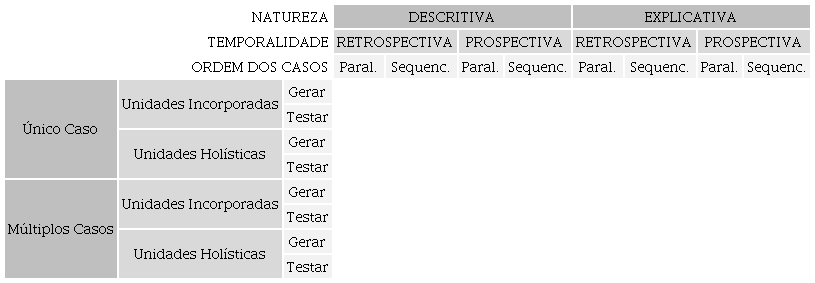 De Vaus (2001) propõe uma forma de pensarmos os diferentes tipos de estudos de caso a partir da combinação entre diferentes elementos que compõem sua natureza: temporalidade, ordenamento dos casos, tratamento da teoria, relação das unidades de análise e número de casos. Segundo o autor, combinações entre esses fatores resultam em 64 possibilidades lógicas diferentes para compor um desenho de estudo de caso, cada uma com formas distintas de condução, análise e coleta de dados. No quadro 2 é possível encontrar as variações possíveis dos desenhos de estudo de caso, segundo o autor.