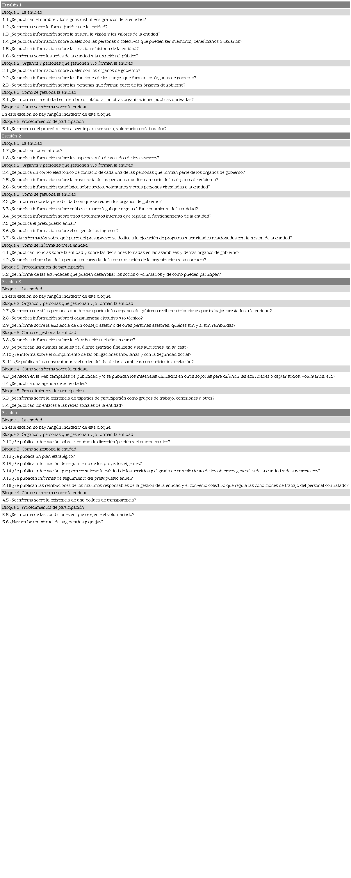 Presentamos, en la Tabla 1, la relación de indicadores (excluyendo los del escalón 5 por ser preguntas opcionales, o de respuesta voluntaria, que no forman parte del sistema de evaluación o autoevaluación), distribuidos en escalones y bloques de información, para la evaluación de las entidades de tipología "otros" tipos de entidades, ya que es la que presenta un redactado neutro que no alude a las circunstancias específicas de las otras tres categorías. Los criterios de aplicación de cada uno de estos indicadores definen con precisión las informaciones y condiciones de publicación necesarias para evaluar positivamente el indicador correspondiente y están disponibles en la plataforma para los usuarios registrados (no los exponemos en este trabajo por su extensión).