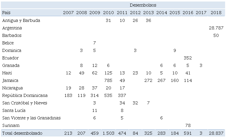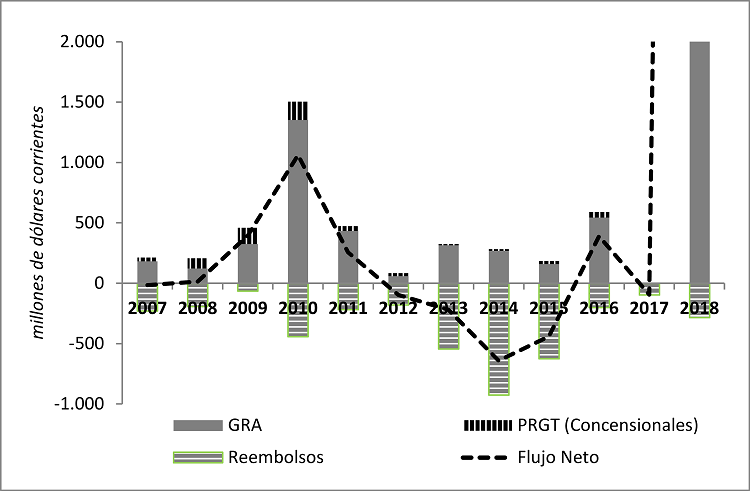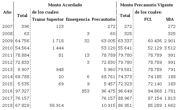 Al tratarse de economías pequeñas, los desembolsos tuvieron una escala muy pequeña (el acuerdo más importante, con República Dominicana, no superó los 2 mil millones de dólares). En efecto, durante el período 2008-2015 el desembolso promedio anual del FMI a Latinoamérica fue de 363 millones de dólares, lo cual constituye la etapa con los desembolsos más bajos en términos reales de la historia (NEMIÑA; LARRALDE, 2018, p. 295).
