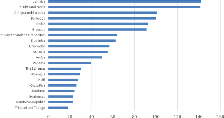 Como puede apreciarse, el Caribe constituye la subregión con más países (diez) que recibieron desembolsos del FMI en el decenio posterior a la crisis financiera. Se trata de países en su mayoría altamente endeudados, que sufrieron el impacto externo por la combinación del desplome del turismo receptivo, la suba de los costos financieros y diversos desastres naturales. Muchos de ellos también poseen regímenes cambiarios de paridad fija tipo peg, que impiden amortiguar el shock externo mediante una variación del tipo de cambio. De los diez países que recibieron financiamiento, cinco fueron programas del tramo superior de crédito12 (República Dominicana, Jamaica, Antigua y Barbuda, San Cristóbal y Nieves y Barbados), un programa precautorio (Jamaica) y el resto programas concesionales o de emergencia ante catástrofes naturales como huracanes o terremotos (Dominica, Santa Lucía, San Vicente y las Granadinas, Haití y Granada). A excepción de República Dominicana, que en 2012 decidió discontinuar con el stand by acordado en 2009 debido la exigencia de incrementar las tarifas del servicio de electricidad (JIMÉNEZ, 2012),13 los acuerdos restantes de tramo superior apoyaron programas de reestructuración de la deuda (ACEVEDO MEJÍA, 2014); notablemente, se trata de los cuatro países del Caribe más endeudados a 2009 (Gráfico 2).14 En estos casos, el FMI actuó no solo como prestamista en economías pequeñas con problemas de balanza de pagos sino, al igual que en Grecia e Islandia pos 2008, como garante de los procesos de reestructuración de deuda.