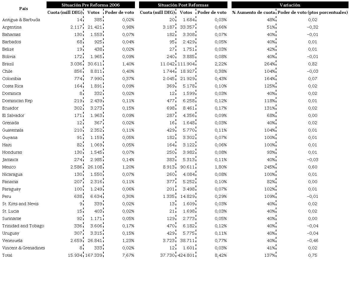 En lo que respecta a los países de Latinoamérica, las consecuencias de las reformas del gobierno del FMI son dispares. Países como Brasil y México lograron significativos aumentos de cuotas (264% y 245%, respectivamente) e incrementos en su poder de voto dentro del Directorio del FMI (0.82 y 0.60 puntos porcentuales). Colombia y Ecuador también alcanzaron aumentos de cuotas por encima de la media (164% y 131%), lo que les permitió mejorar levemente su poder de voto (0.07 y 0.02 pp.). Por su parte, las economías más pequeñas de la región tuvieron aumentos de cuota entre el 40% y 100%, pero lograron mantener su poder de voto en el FMI gracias al incremento de los “votos básicos". Por último, Venezuela y Argentina, con aumentos de cuota muy por debajo de la media (40% y 51%), vieron seriamente disminuida su influencia en la toma de decisiones del Directorio del FMI (0.46 y 0.32 pp).
