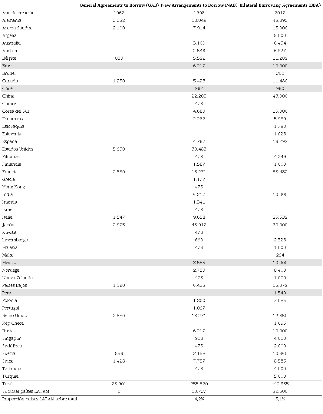 La creación del acuerdo bilateral y la ampliación del NAB tuvieron una doble motivación. Por un lado, reforzar las líneas de financiamiento del FMI debido a la demora en la aprobación de la reforma de las cuotas por la oposición republicana en el Congreso de los EE.UU.; por otro, brindar mayor margen de participación a los países en desarrollo y las potencias emergentes, en línea con el reclamo de mejorar la representación de estos países en las instituciones de Bretton Woods. En este sentido, aparte de los países del bloque BRICS, vale destacar la participación de cuatro países latinoamericanos en esos fondos adicionales (ver en Tabla 2).