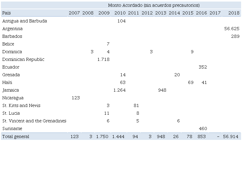 Las tablas 3, 4 y 5 presentan un detalle de todos los países que acordaron programas de financiamiento y aquellos que efectivamente recibieron desembolsos por parte del organismo. La diferencia radica en que en algunos casos los programas poseen una naturaleza precautoria, es decir, están pensados como una garantía ante los mercados internacionales, concluyen antes del tiempo establecido o debido a una mejora de las condiciones económicas los países deciden no hacer uso de los desembolsos disponibles.