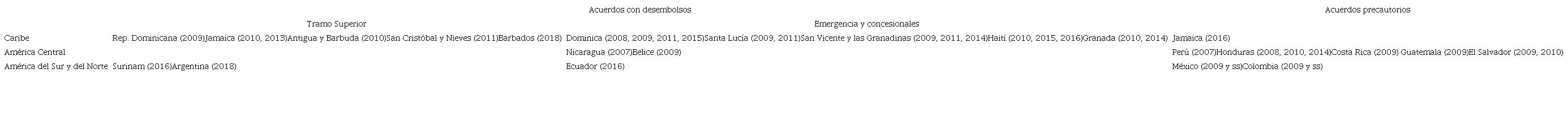 El Cuadro 1 resume el análisis al detallar a los países de América Latina y el Caribe que suscribieron programas con el FMI y recibieron financiamiento entre 2007 y 2018. En las primeras dos columnas se indican aquellos países que recibieron desembolsos en el marco de un programa de tipo Stand by de tramo superior (primera columna) o un programa concesional y/o asistencia de emergencia ante catástrofes naturales como huracanes o terremotos (segunda columna). En la tercera, aparecen aquellos países que suscribieron acuerdos precautorios, es decir, que no recibieron desembolsos efectivos (tercera columna).