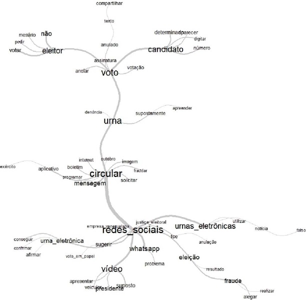 De maneira a identificar tais informações falaciosas, realizou-se uma análise de similitude que tornou possível evidenciar a ocorrência dos termos manifestados e a conectividade entre eles, que fundamentam a estrutura de conteúdo das 35 denúncias consideradas, inferindo os temas que estiveram mais relacionados às informações falsas esclarecidas. Na Figura 1, observa-se que há quatro termos que mais se destacaram, são eles: “voto”, “urna”, “circular” e “redes sociais”. Delas se ramificam outras expressões de relevância como “eleitor”, “candidato”, “vídeo” e “urnas eletrônicas”.