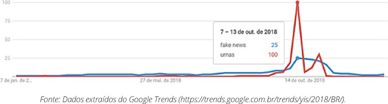 Para ilustrar a relação das fake news com o tema “fraude nas urnas eletrônicas” nas eleições majoritárias de 2018, realizou-se, pelo presente estudo, uma pesquisa no Google Trends a fim de analisar e apresentar a relevância dos temas e assuntos de maior movimentação na plataforma, pela internet, em 2018, considerando os termos de pesquisa “fake news” e “urnas”. Dessa forma, o Google Trends comparou os termos e apresentou, em posições de maior relevância, os que mais movimentaram a internet durante o período em análise. Os dados são apresentados em uma escala de 0 (zero) a 100 (cem), sendo que o valor de 100 representa o maior pico de popularidade de um determinado termo. Os valores a partir de 0 (zero) demonstram o grau de popularidade do termo, que podem crescer de acordo com a movimentação dos usuários na plataforma, variando desde nenhuma relevância a relevância moderada (escala de 0 a 50) e relevância moderada a alta relevância (escala de 50 a 100), conforme pode ser observado na Figura 2.