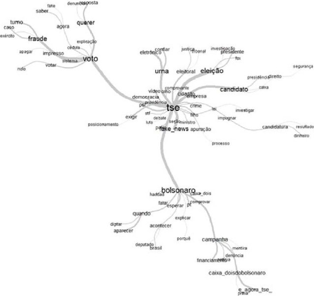 Assim, foram tratados os comentários coletados nas publicações realizadas pelo TSE em seu perfil no Facebook. De acordo com a representação, que pode ser visualizada na Figura 4, identificou-se que nos comentários dos usuários três palavras apresentaram-se em destaque, são elas: “tse”, que remete ao próprio tribunal, “voto” e “bolsonaro”. Delas ramificam-se outras expressões que aparecem de forma significativa, como: “urna”, “eleição”, “candidato” e fraude”. No extremo das ramificações há relações como (1) “turno”, “fraude” e “voto”; (2) “resposta”, “querer” e “explicação”; (3) “eletrônico” e “urna”; e (4) “e agora tse?”, “caixa dois do bolsonaro” e “campanha”. A Figura 4 ilustra o cenário observado nas opiniões compiladas e codificadas a partir da análise da estrutura textual.