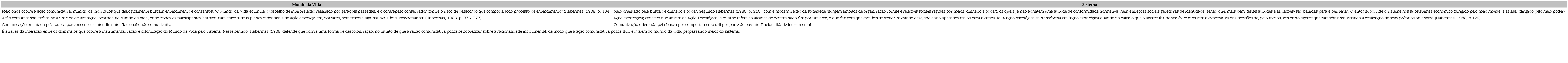 Habermas (2012) divide as interações em duas perspectivas, sendo elas: o mundo da vida e o sistema. O mundo da vida representa a esfera em que a ação comunicativa se desenvolve e as interações se orientam na busca por se chegar ao entendimento. Nessa esfera, os indivíduos interagem, criticam e refletem acerca de determinado aspecto. O resultado dessa interação é produto da própria comunicação, e não uma deliberação advinda de alguma imposição. Já o sistema se refere à esfera orientada pela produção material, em que são criados valores que os indivíduos devem seguir para se manterem nesse sistema. Para fins deste artigo, a TAC pode ser sintetizada no Quadro 1.