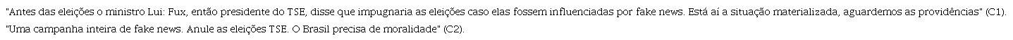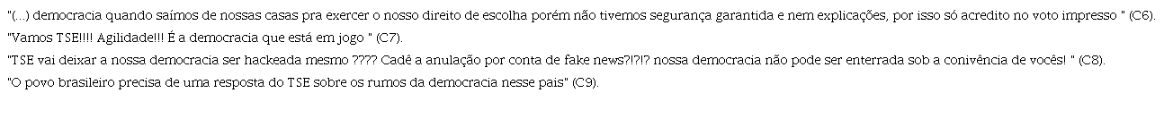 Ainda sobre o questionamento da legitimidade do processo eleitoral, aspectos que remetem à democracia aparecem em alguns comentários, em especial, qualificando as fake news como uma ameaça ao regime democrático (Quadro 5).