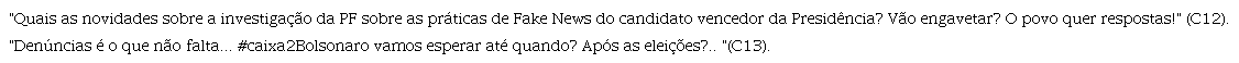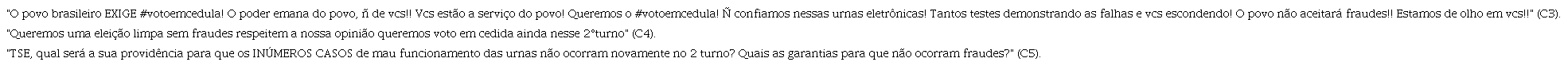 Tais posicionamentos estiveram associados a manifestações de que Bolsonaro estaria sendo prejudicado, entendendo que as eleições estariam sendo fraudadas e não reconhecendo a legitimidade das condições de votação e, principalmente, do uso das urnas eletrônicas, que estariam sendo manipuladas. Outros exigiam a impugnação da candidatura de Bolsonaro, já no segundo turno, a partir de informações de que estaria envolvido em esquema de caixa dois em sua campanha e se utilizava de mecanismos de disparo de informações falsas contra o candidato adversário. Representada por uma das ramificações observadas no gráfico de similitude, houve, nesse caso, a mobilização dos usuários no Facebook a partir da hashtag “#EagoraTSE?” (Quadro 7).
