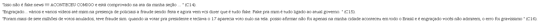 Relacionando os encadeamentos identificados nos comentários dos usuários e os tipos de fake news denunciadas, observou-se uma convergência para a disseminação de informações que questionavam a legitimidade das condições para a realização das eleições, com muitos solicitando explicações a respeito dos relatos de fraudes nas votações. Como identificado nas denúncias analisadas, houve circulação de mensagens e vídeos de pessoas que alegavam não ter conseguido votar ou confirmar seu voto. Nessas questões relacionadas ao voto, destaca-se a manifestação favorável ao retorno do sistema de votação com cédulas de papel em vez das urnas eletrônicas. Já outros difundiam a informação sobre a ocorrência de anulação de votos destinados ao então candidato do PSL, Jair Bolsonaro, quando o eleitor digitava o número dessa candidatura (Quadro 4).